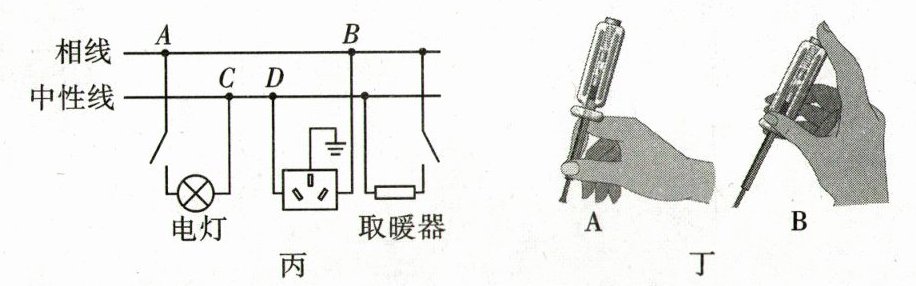 (3)如图丙所示,电灯和取暖器正常工作,在三孔插座上接入一个电饭锅后,取暖器突然停止工作,拔下电饭锅后,电灯正常发光。小明判断应该是发生了断路,于是用测电笔去判断故障位置。