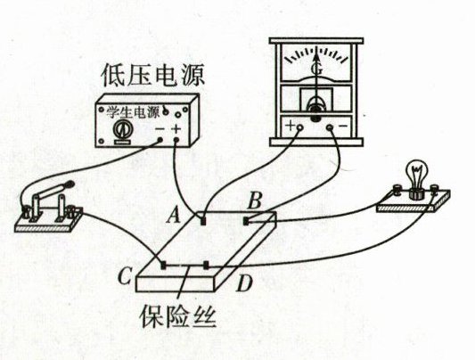 (1)在$CD$间接上一段保险丝,$AB$间接入电流表,其他部分按如图所示连接好电路。