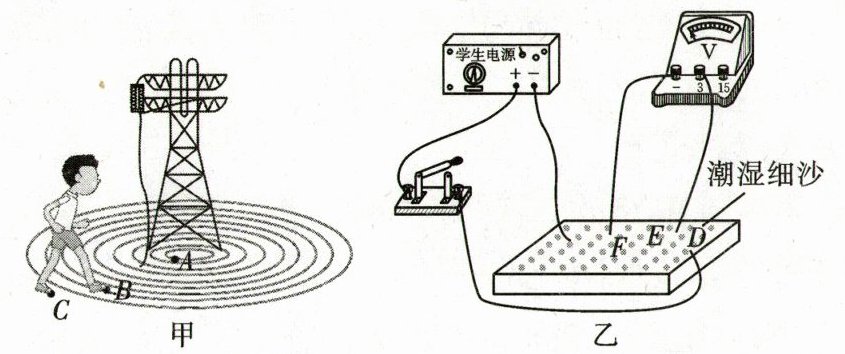 为了粗略地探究“跨步电压的大小如何变化”,小明设计了如图乙所示的模拟电路装置进行实验。实验主要步骤如下: