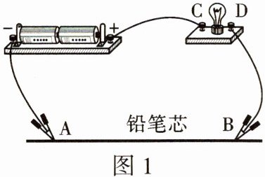 (选填“C 到 D”或“D 到 C”);当夹子 A 夹住铅笔芯向夹子 B 滑动时,小灯泡亮度变亮