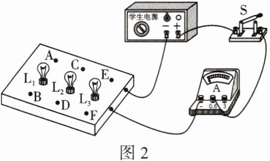 2.(2025·陕西)小明对一个电学暗箱进行了实验探究。如图2所示,A、B是小灯泡L₁的接线柱,C、D是小灯泡L₂的接线柱,E、F是小灯泡L₃的接线柱。实验操作及对应的现象如表所示。下列分析正确的是(