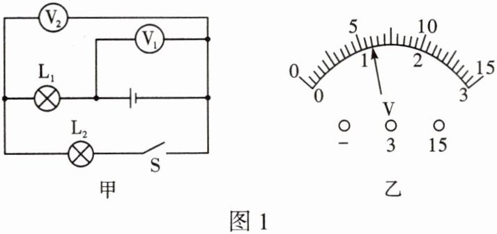 1.在图1甲所示的电路中,当闭合开关S后,两灯均发光,两个电压表指针偏转均如图1乙所示,则灯L₁两端的电压为