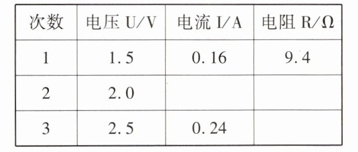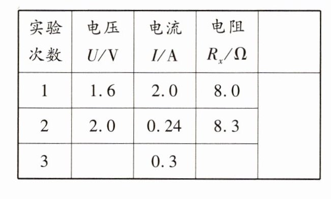 (4)在伏安法测电阻的实验中,采用多次测量求平均值的方法来减小误差,故表格中第一行的最后空格栏内应填写的内容是电阻平均值$R_{平均}/\Omega$;电压表选用的量程为0~3V,分度值为0.1V,示数为2.4V,$R_3=\frac{U_3}{I_3}=\frac{2.4V}{0.3A}=8.0\Omega$。$R_x$阻值的平均值$R_{平均}=\frac{(R_1+R_2+R_3)}{3}=\frac{(8.0\Omega+8.3\Omega+8.0\Omega)}{3}=8.1\Omega$。
