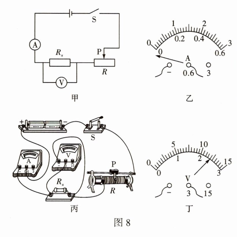 (选填“断开”或“闭合”)。(3)根据图 8 甲的电路图,把图 8 丙中的实物图连接成完整电路(有两条导线未连接),要求开关闭合时电流表示数最小,测量时电表示数尽可能精确。待测电阻$R_x$左端接线柱连一根线到电压表的“3”接线柱,那么$R_x$右端接线柱连一根线到滑动变阻器的电阻线的