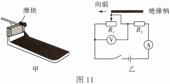 12. 【新情境】中小学生的体能测试中有一个项目为坐位体前屈。测试者向前推动固定在滑动变阻器滑片上的滑块,滑块被推动的距离越大,仪器的示数就越大。图 11 甲是体育课上的坐位体前屈测量仪,图 11 乙是小明设计的模拟电路。下列说法正确的是 (