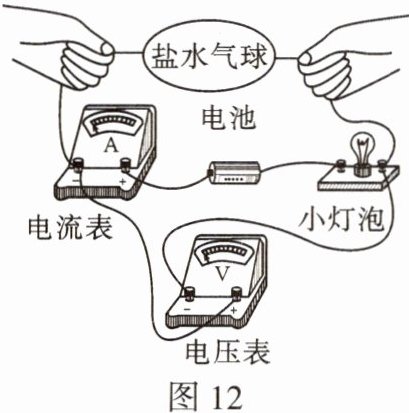 13. 【新情境】某学习小组把装满盐水的气球连接在如图 12 所示的电路中,电路接通后灯泡发光。向相反的方向拉扯连接气球的导线,使气球变长。下列说法正确的是(