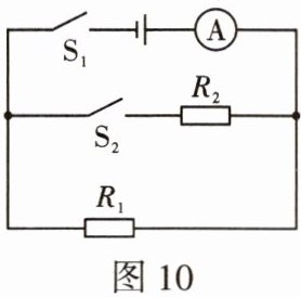 11. 如图 10 所示的电路中,电源电压保持不变,电阻 $R_1 = 20\ \Omega$。只闭合开关 $S_1$ 后,电流表的示数为 $0.3 A$,再闭合 $S_2$,电流表的示数为 $0.5 A$,求: