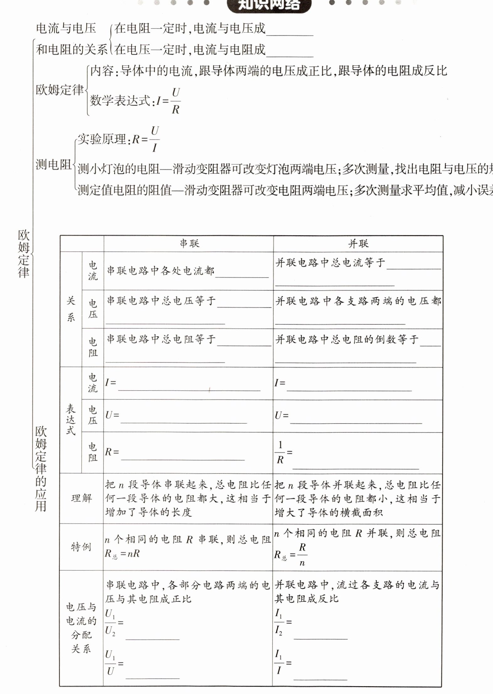正比 反比 相等 各支路中电流之和 各部分电路两端的电压之和 相等 各部分电路电阻之和 各支路电阻的倒数之和