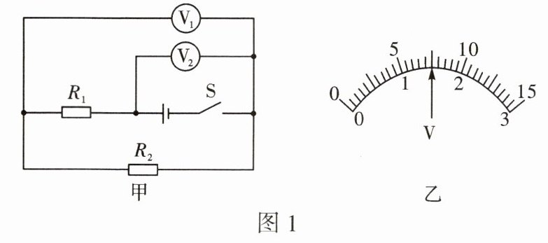 2.如图1甲所示的电路中,闭合开关后两只电压表的指针偏转均如图1乙所示,则$R_1$与$R_2$的电阻之比为_。若只有一个电压表有示数且电路中只有一处故障,且只发生在电阻上,则故障可能是_。