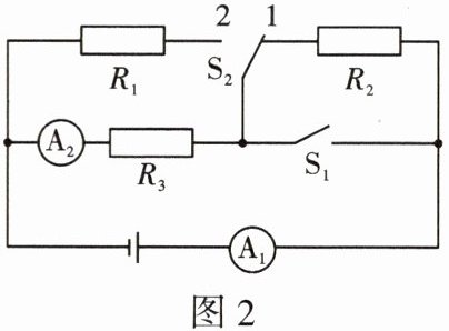 2.(2024·江西)如图2所示,三个电阻$R_1$、$R_2$、$R_3$的阻值均相同,开关$S_1$断开、开关$S_2$掷到1,电流表$A_1$与电流表$A_2$的示数之比为_;当开关$S_1$闭合、开关$S_2$掷到2时,电流表$A_1$与电流表$A_2$的示数之比为_。