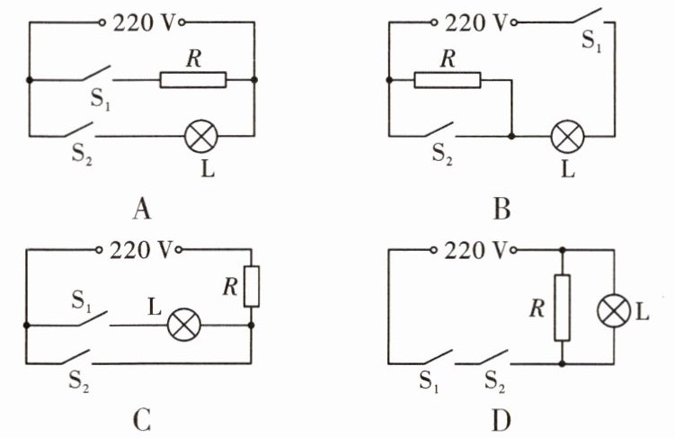 5.D 【解析】经分析可知,压力开关$S_1$和温控开关$S_2$串联,共同控制指示灯和加热电阻。由电路图A可知,只要压力开关$S_1$闭合,无论温控开关$S_2$是否闭合,加热电阻都能工作,故A不符合题意;由电路图B可知,只要压力开关$S_1$闭合,无论温控开关$S_2$是否闭合,指示灯都亮,故B不符合题意;由电路图C可知,只要温控开关$S_2$闭合,无论压力开关$S_1$是否闭合,指示灯都不亮,故C不符合题意;由电路图D可知,压力开关$S_1$和温控开关$S_2$串联,共同控制指示灯和加热电阻,故D符合题意。
