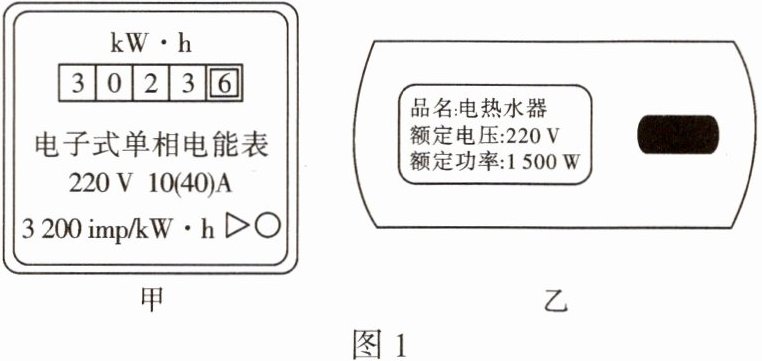 $kW· h$。现仅接通一台如图 1 乙所示的电热水器,热水器 1 min 内消耗的电能为$9.0 × 10^{4}$