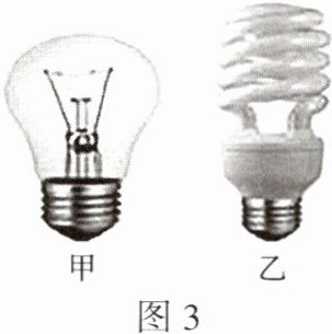 7.目前我国大力提倡节约型社会理念,一款高效节能灯在城乡家庭中广泛使用。将“220 V 100 W”的白炽灯(图 3 甲)与“220 V 20 W”的节能灯(图 3 乙)做对比实验,发现两灯发光效果相当。