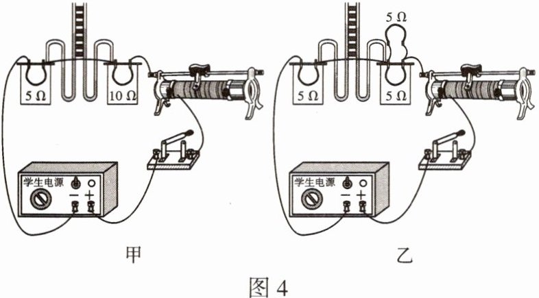 6.(多选)在“探究电流通过导体产生的热量与哪些因素有关”的实验中,某同学采用了如图4甲、乙所示的实验装置(两个透明容器中封闭着等量的空气)。下列说法正确的是(