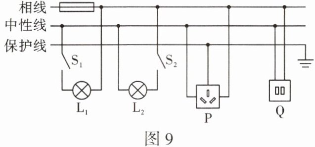 10.CD 【解析】为了保证用电安全,控制灯泡的开关应连接在相线与灯泡之间,即开关应控制相线,图中S₁控制的是中性线,故A错误;带金属外壳的用电器必须接保护线,以免漏电,引起触电事故,所以使用电冰箱时必须使用P插座,故B错误;灯泡L₂、插座Q是并联的,使用时互不影响,所以如果灯泡L₂不能正常工作,插座Q可能可以正常工作,故C正确;图中S₂控制的是相线,开关断开,灯L₂不带电,若断开开关S₂,正确使用验电笔检查灯泡L₂两端接线柱,氖管都不会发光,故D正确。
