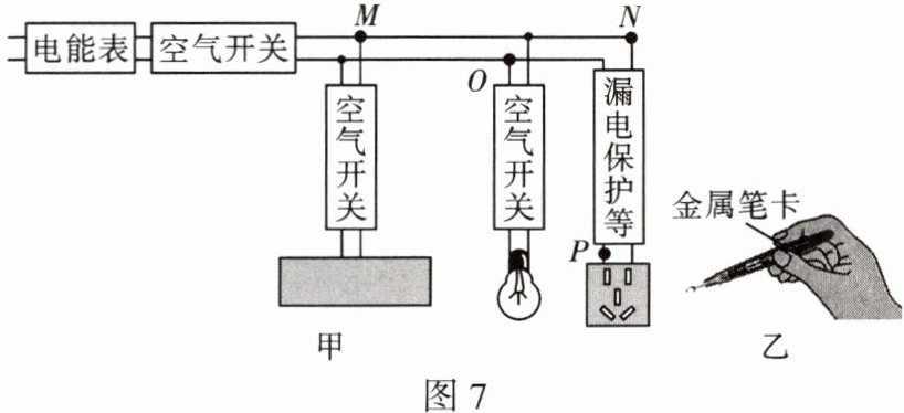 8. 跨学科 物理学与日常生活 图 7 甲是家庭电路中常用的空气开关和漏电保护器安装图,图 7 乙是测电笔。以下选项正确的是(