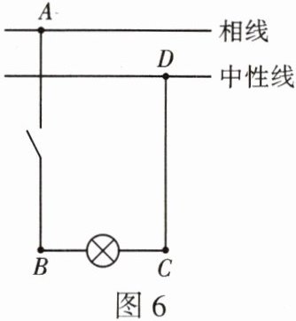 7. 如图 6 所示的电路中,开关闭合后,若灯泡不发光,用测电笔分别检测 A、B、C、D 四点,发现四个点都能使测电笔的氖管发光,则电路中的故障可能是(