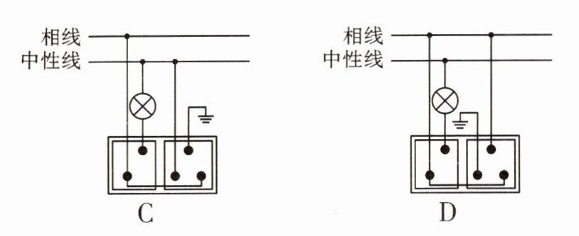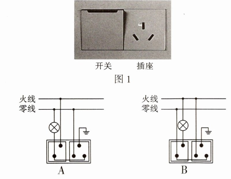 3. 跨学科 物理学与工程实践 在家庭电路中安装一个“一开三孔”开关的插座面板,如图1所示,要求插座能单独使用,开关能控制电灯且符合安全用电原则。从实物正面观察,下列几种接线中符合要求的是(