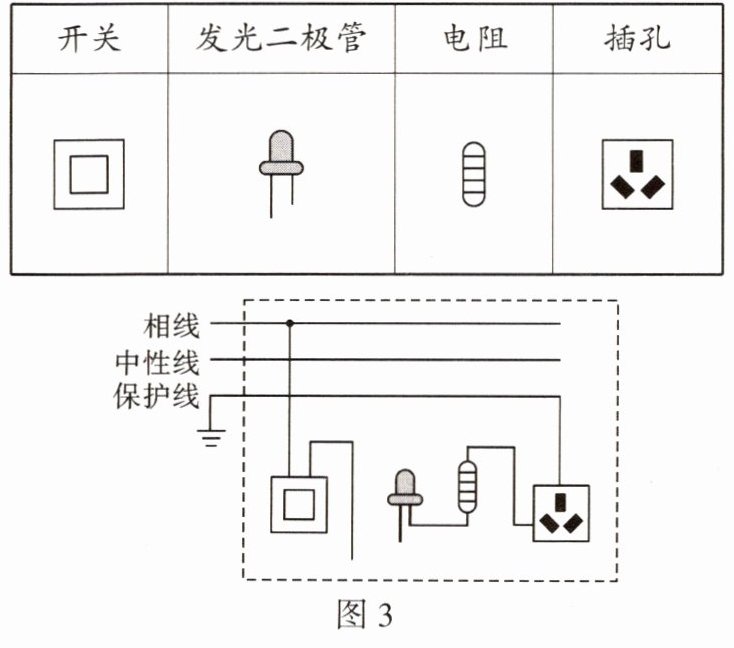 5. 跨学科 物理学与工程实践 小明在使用插线板时发现:插线板上的开关断开时,指示灯不发光,插孔断电;开关闭合时指示灯发光,插孔通电;如果指示灯损坏,开关闭合时插孔照样可以通电。如图 3 所示,虚线框内为插线板内部电路简化示意图,请按上述要求用笔画线代替导线将插线板内部电路中的缺失部分补画完整。