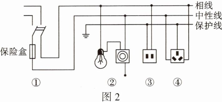 4.图 2 为部分家庭电路示意图,其中电器元件连接错误的是(