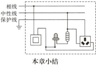 5.如图所示 [解析]分析题意可知,如果指示灯损坏,开关闭合时插孔照样可以通电,说明指示灯和插座之间是并联的,开关同时控制指示灯和插座,接线时要注意:开关接在指示灯、插座和相线之间更安全,发光二极管长脚为正极,接相线,短脚为负极,接中性线,三孔插座的接线是左孔接中性线,右孔接相线,上孔接保护线,如图所示。
