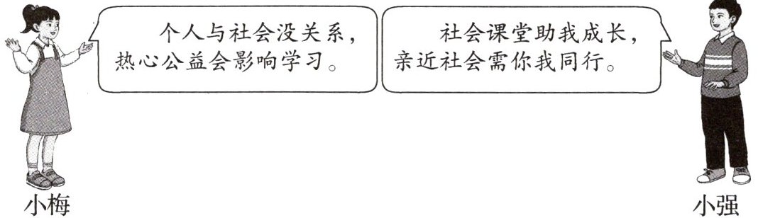 ①小梅认为“个人与社会没关系”的观点是错误的。人是社会的人,人的成长是不断社会化的过程。社会为人的生存和发展提供必要条件,每个人都从社会中获得物质支持和精神滋养。②小梅认为“热心公益会影响学习”的观点是片面的,小强认为“社会课堂助我成长,亲近社会需你我同行”的观点是正确的。公益活动虽然会占用一定的学习时间和精力,但是有利于我们养成亲社会行为,进而养成良好的行为习惯,形成正确的价值观,获得他人和社会的接纳与认可;能够为他人带来温暖,使人际关系更加融洽,为社会增添正能量。