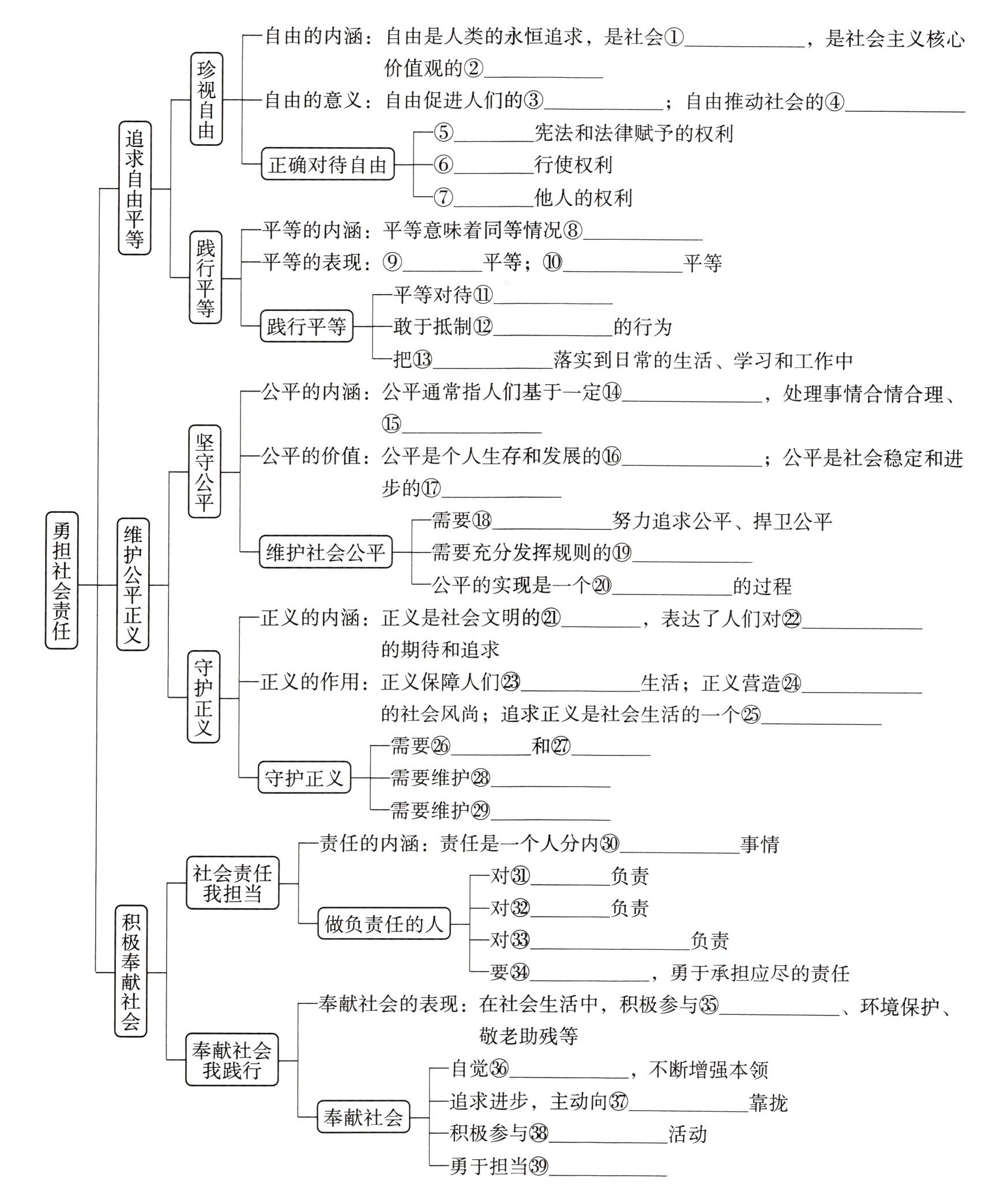 ①活力之源 ②重要内容 ③全面发展 ④繁荣进步 ⑤珍惜 ⑥依法 ⑦尊重 ⑧同等对待 ⑨人格 ⑩权利义务 ⑪他人 ⑫不平等 ⑬平等原则 ⑭标准或原则 ⑮不偏不倚 ⑯重要保障 ⑰重要基础 ⑱每个人 ⑲保障作用 ⑳不断推进 ㉑尺度 ㉒美好社会 ㉓有尊严地 ㉔风清气正 ㉕重要主题 ㉖勇气 ㉗智慧 ㉘司法公正 ㉙国际正义 ㉚应该做的 ㉛自己 ㉜他人 ㉝国家和社会 ㉞甘于奉献 ㉟社区服务 ㊱加强学习 ㊲团组织 ㊳志愿服务 ㊴时代责任