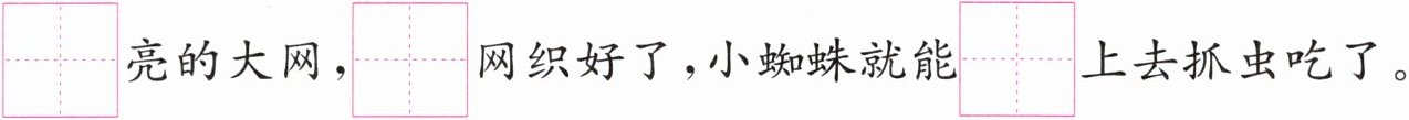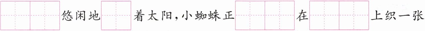 $\overset{\mathrm{l}\mathrm{ǎ}\mathrm{o}\mathrm{w}ū}{□ □ }悠闲地\overset{\mathrm{s}\mathrm{h}\mathrm{à}\mathrm{i}}{□ }$着太阳,小蜘蛛正$\overset{\mathrm{z}\mathrm{h}\mathrm{ǔ}\mathrm{n}\mathrm{b}\mathrm{è}\mathrm{i}}{□ □ }在\overset{\mathrm{m}\mathrm{é}\mathrm{n}\mathrm{b}\mathrm{ǎ}\mathrm{n}}{□ □ }上织一张\overset{\mathrm{p}\mathrm{i}\mathrm{à}\mathrm{o}}{□ }$亮的大网,$\overset{\mathrm{d}\mathrm{ě}\mathrm{n}\mathrm{g}}{□ }$网织好了,小蜘蛛就能$\overset{\mathrm{p}\mathrm{á}}{□ }$上去抓虫吃了。