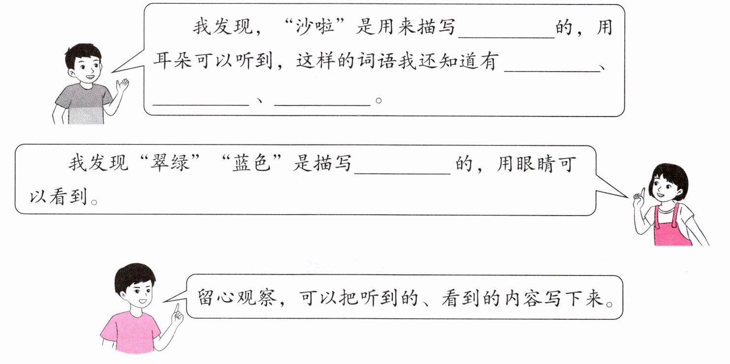 我发现,“沙啦”是用来描写____的,用耳朵可以听到,这样的词语我还知道有____、____、____。