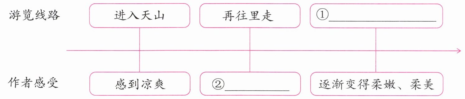 (2)塔松 撑开的巨伞 2.①走进天山深处 ②越来越美 3.表达了作者对七月的天山美景的喜爱、赞美之情。
