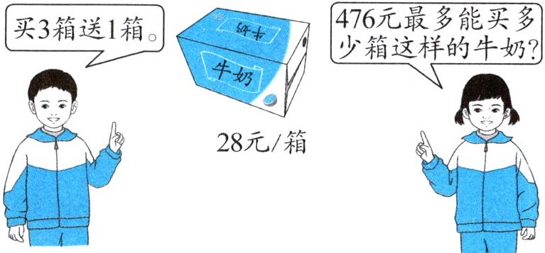28×3=84(元) 476÷84=5……56(元) 56÷28=2(箱) 3+1=4(箱) 5×4+2=22(箱) 答:476元最多能买22箱这样的牛奶。