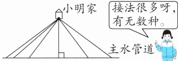 1. 自来水公司的工人叔叔要给新建成的住宅小区各户接引水管。自来水公司的主水管道经过小明家门前,要想用引水管把水接到小明家里来,有多少种接法?哪种接法最省材料?