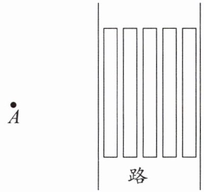 2. 下图中,小刚站在路的左侧点A处,要到路的右侧,怎样走最近?把最近的路线画出来。