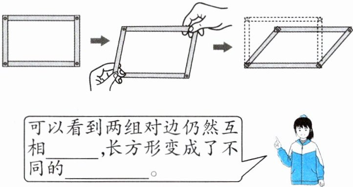 。4. 做一做:用四根小木条和四个小钉子钉成一个长方形木框,然后用两手捏住木框的两个对角,向相反方向拉。