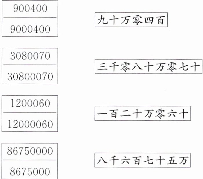 900400 - 九十万零四百;30800070 - 三千零八十万零七十;1200060 - 一百二十万零六十;86750000 - 八千六百七十五万
