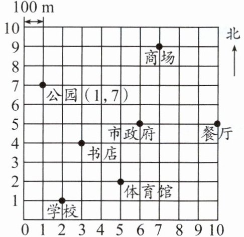)(2) 聪聪家在书店以东 300 m,再往南 400 m 处;明明家在学校以北 500 m,再往东 200 m 处。在图上分别标出他们两家的位置,并用数对表示出来。