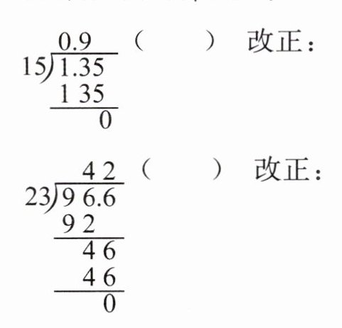) 改正:$\begin{array}{r} 42\\ 23\enclose{longdiv} {96.6}\\ 92\\ \hline 46\\ 46\\ \hline 0\end{array} $(