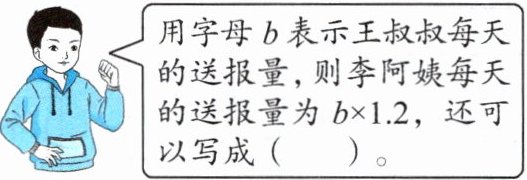探究:王叔叔和李阿姨每天骑车送报,王叔叔每天比李阿姨多骑 20 km 的路程,李阿姨每天的送报量是王叔叔的 1.2 倍。用含有字母的式子表示数量关系。