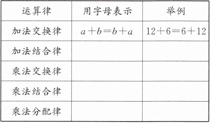 加法结合律 (a+b)+c= a+(b+c) (12+6)+4= 12+(6+4)
