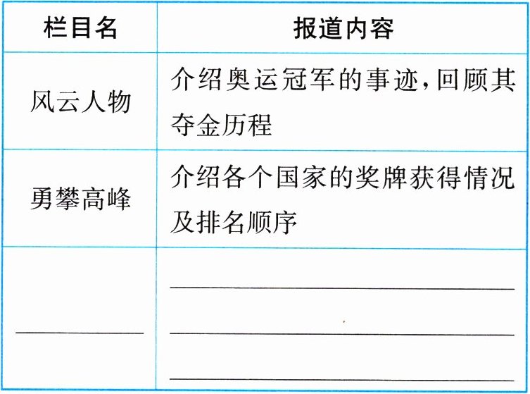 (1)奥运会结束后,同学们计划编辑一期新闻小报。请你仿照示例再设计一个栏目,并概括栏目内容。