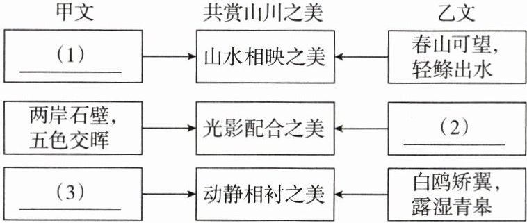 (3)晓雾将歇,猿鸟乱鸣/夕日欲颓,沉鳞竞跃 12.甲文:表达了作者对谢灵运的钦敬和追慕;惋惜于世人对秀美山水的无动于衷;为自己的审美情趣而自许,有与谢灵运比肩之意(2分)。乙文:友人不在,有遗憾、惋惜之感,也有对能与友人共赏美景的期待(2分)。