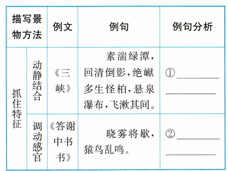 7. 你所在的语文学习小组以《三峡》和《答谢中书书》为例,学习描写景物。根据提示填写表格。(4 分)