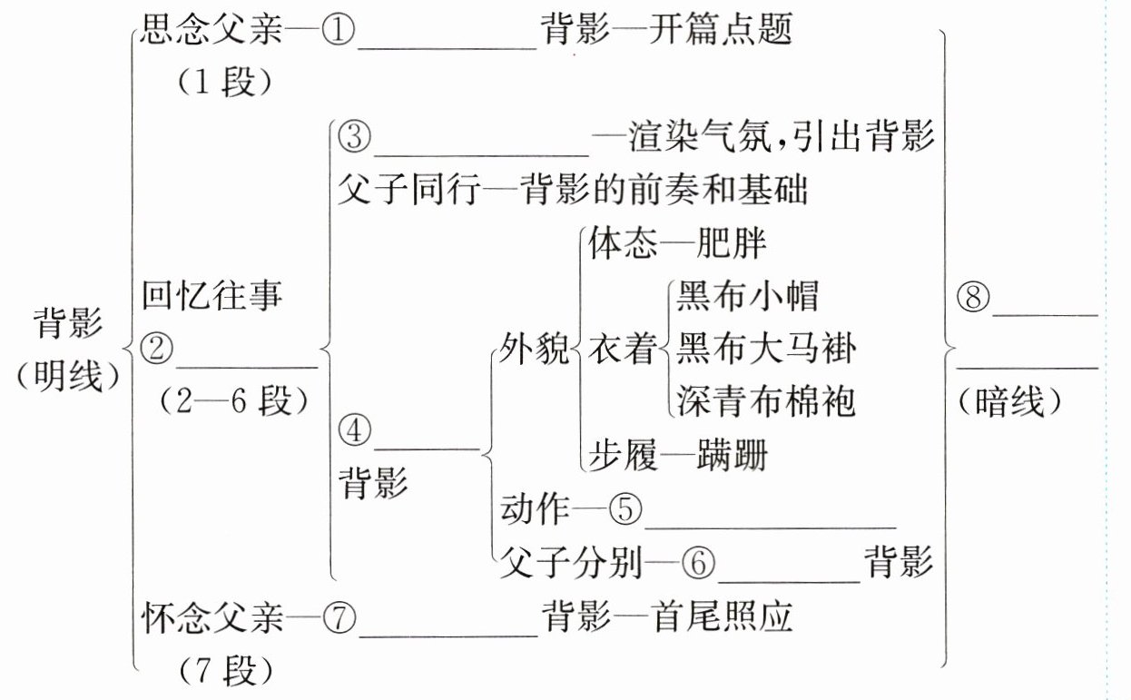 ①难忘 ②买橘送别 ③父子奔丧 ④刻画 ⑤探、攀、缩、倾 ⑥惜别 ⑦再忆 ⑧父子情深