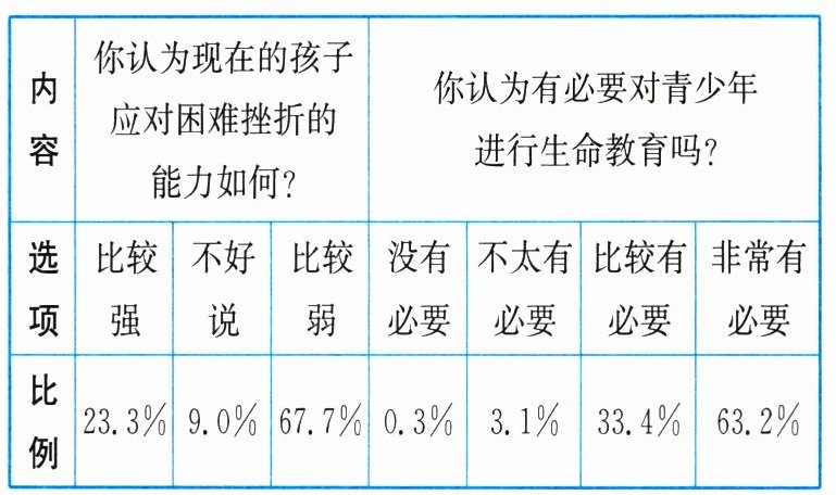 (1)①近七成的受访者认为现在的孩子应对困难挫折的能力比较弱;②超过六成的受访者认为对青少年进行生命教育非常有必要。