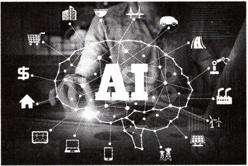 ①一个形似大脑的图案,中间写有“AI”字样 ②AI在不同领域的应用
