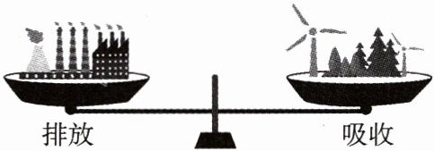 画面主体是天平,左侧托盘画有排烟的烟囱,托盘下面是“排放”二字;右侧托盘画有风力发电设施和树木,托盘下面是“吸收”二字。该宣传画通过天平平衡的画面,倡导减少碳排放、增加绿色能源和碳吸收的理念,达到碳中和目标。