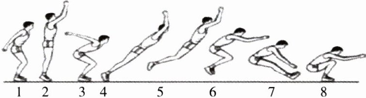 (加大/减小)两臂后摆幅度和两腿屈膝幅度,身体重心落在前脚掌上,随着两臂有力向前上方摆动,两腿快速用力蹬地,下肢踝、膝、髋关节充分伸直,上肢展腹、挺胸,使身体向前上方腾起。落地缓冲时,两臂自前上方向前下方用力摆动的同时,收腹举腿,两腿前伸,脚跟先着地,屈膝缓冲,身体重心迅速移到脚着地点,两臂③
