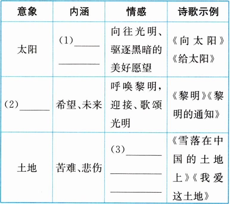|太阳|(1)______|向往光明、驱逐黑暗的美好愿望|《向太阳》《给太阳》|
