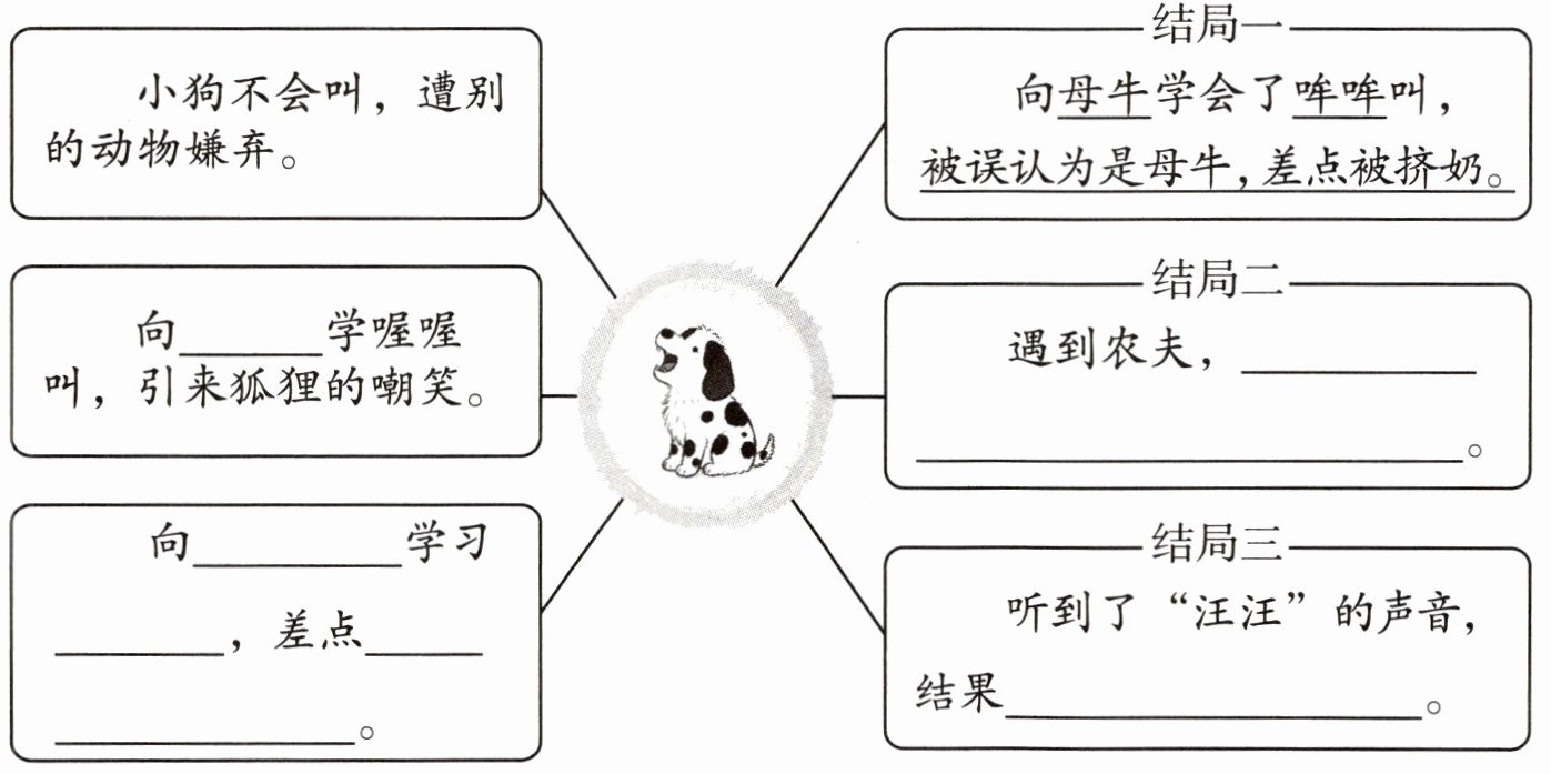 一、读课文,梳理小狗学叫的经历,预测故事的不同结局,照样子填空。