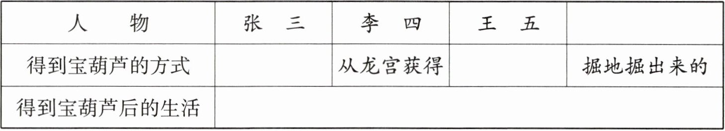 1. 根据奶奶给王葆讲的故事,将下面的表格填写完整。